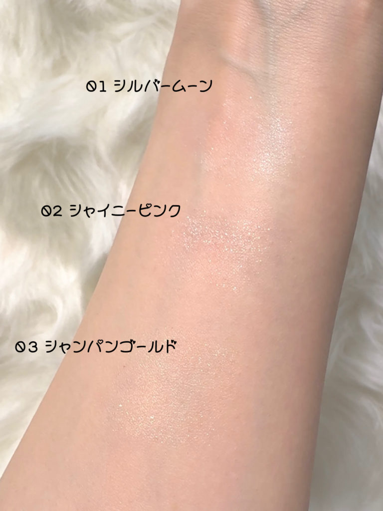 ぷにっとした質感が肌の凹凸にフィットしやすく、細かいラメが均等に広がります。